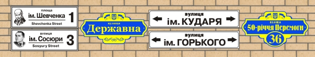 Барвенково, Харьковской области, с.м.т. Кожанка, Киевской области, один из районов Одессы и еще несколько крупных администраций выбрали алюминиевые таблички, изготовленные по принципу автономеров - прямоугольной формы, с белым светоотражающим фоном и черными буквами