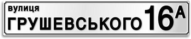 Высота этой таблички 220мм, ширина зависит от количества символов, наличия или отсутствия логотипа. Высота символов в названии улицы 75мм, цифры в номере дома 170мм. Нанесение герба любого города стоит 75грн